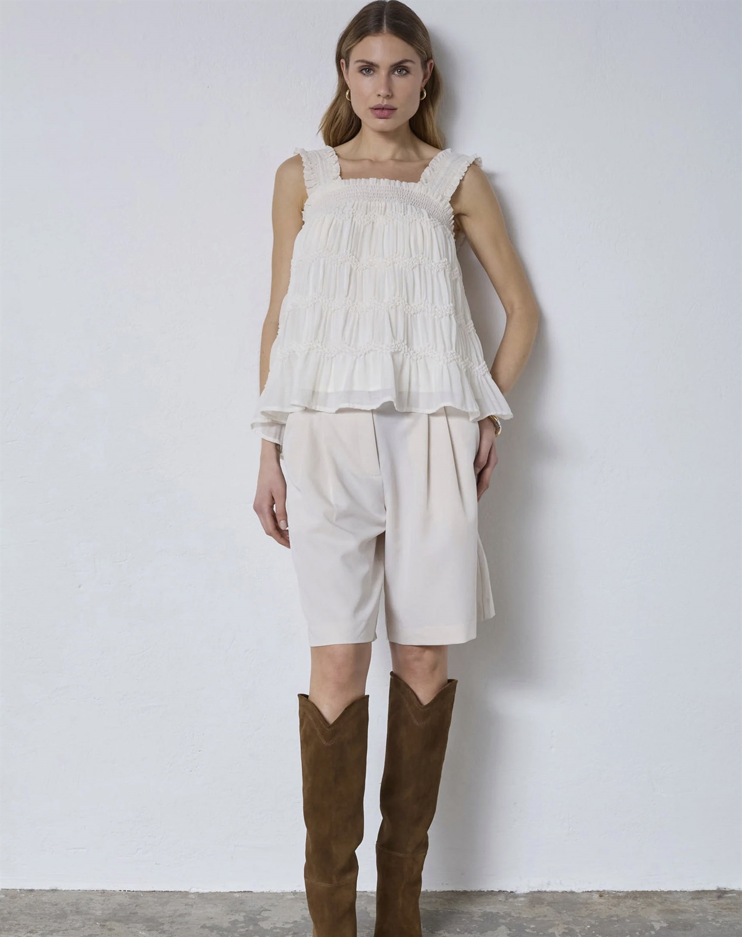 Style den med højtaljede jeans og sneakers til hverdag, eller skift til nederdel og sandaler, når looket gerne må være lidt mere elegant. Smock-detaljerne giver en lækker struktur og et lille ekstra twist, der fungerer til både afslappede dage og pænere planer.