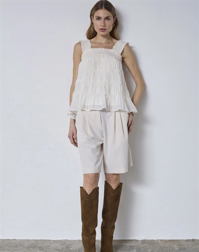 Det er en top, du hurtigt får lyst til at bruge igen og igen: Den er nem at kombinere, har en diskret elegance og er lavet med fokus på komfort, så du kan bevæge dig frit hele dagen. Perfekt til alt fra brunch til en aften ude.