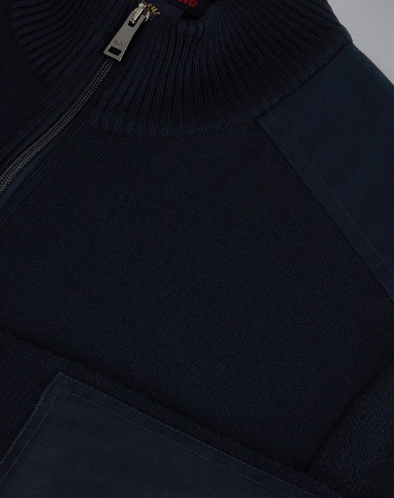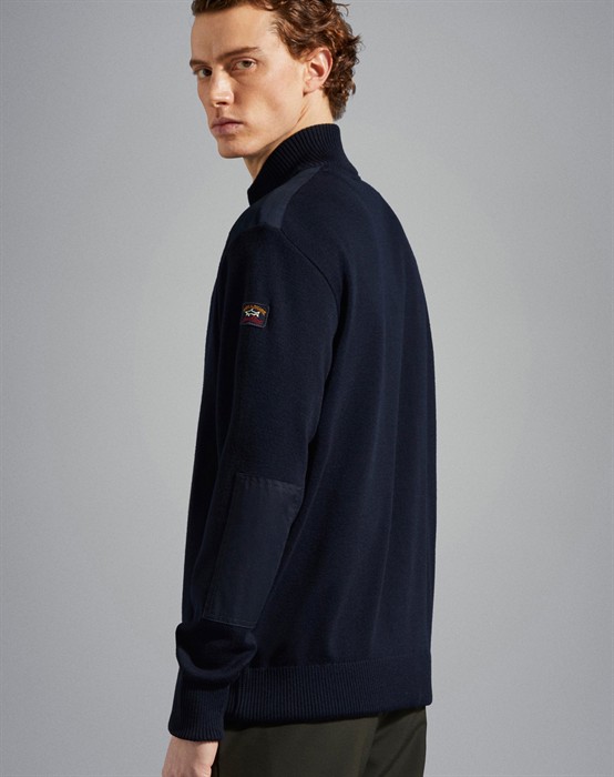 Full Zip Iconic Badge Knit Cardigan - PAUL & SHARK Lækker cardigan fra PAUL & SHARK i som altid rigtig høj kvalitet. Cardiganen har høj krave, gennemgående lynlås, lommer med lynlås og ribbet kanter ved krave, ærmer og i bunden. Den har fede detaljer ved skuldre, albuer og lommer samt det klassiske, broderede PAUL & SHARK logo på venstre overarm. Cardiganen er lavet af 50% merino uld og 50% akryl, hvilket gør den åndbar og god varm. Oplev alle de fede styles i lækre kvaliteter fra PAUL & SHARK her.