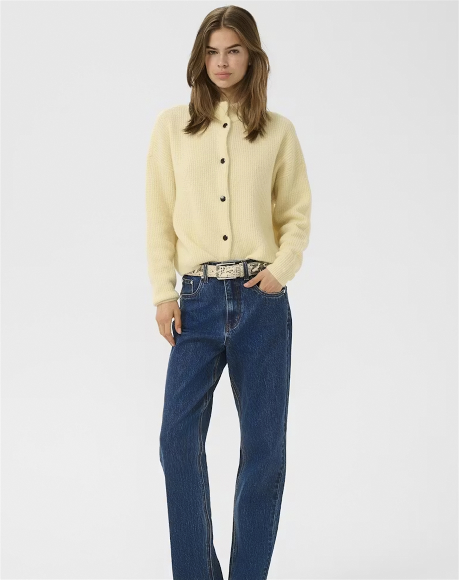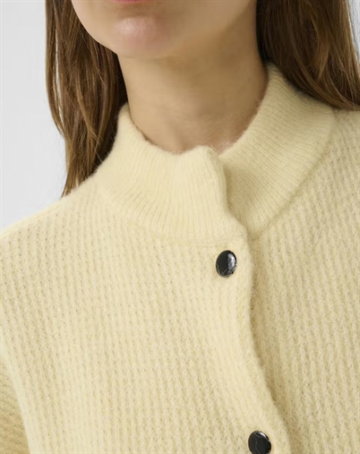 AlphaGZ er skøn, fordi den kan bruges igen og igen og giver ekstra varme uden at tage noget fra det feminine udtryk. Den korte silhuet åbner for mange stylingmuligheder, mens farven tilfører et roligt, men raffineret, præg. En cardigan med komfort og stil, som glider lige godt ind i hverdagen som til særlige planer.