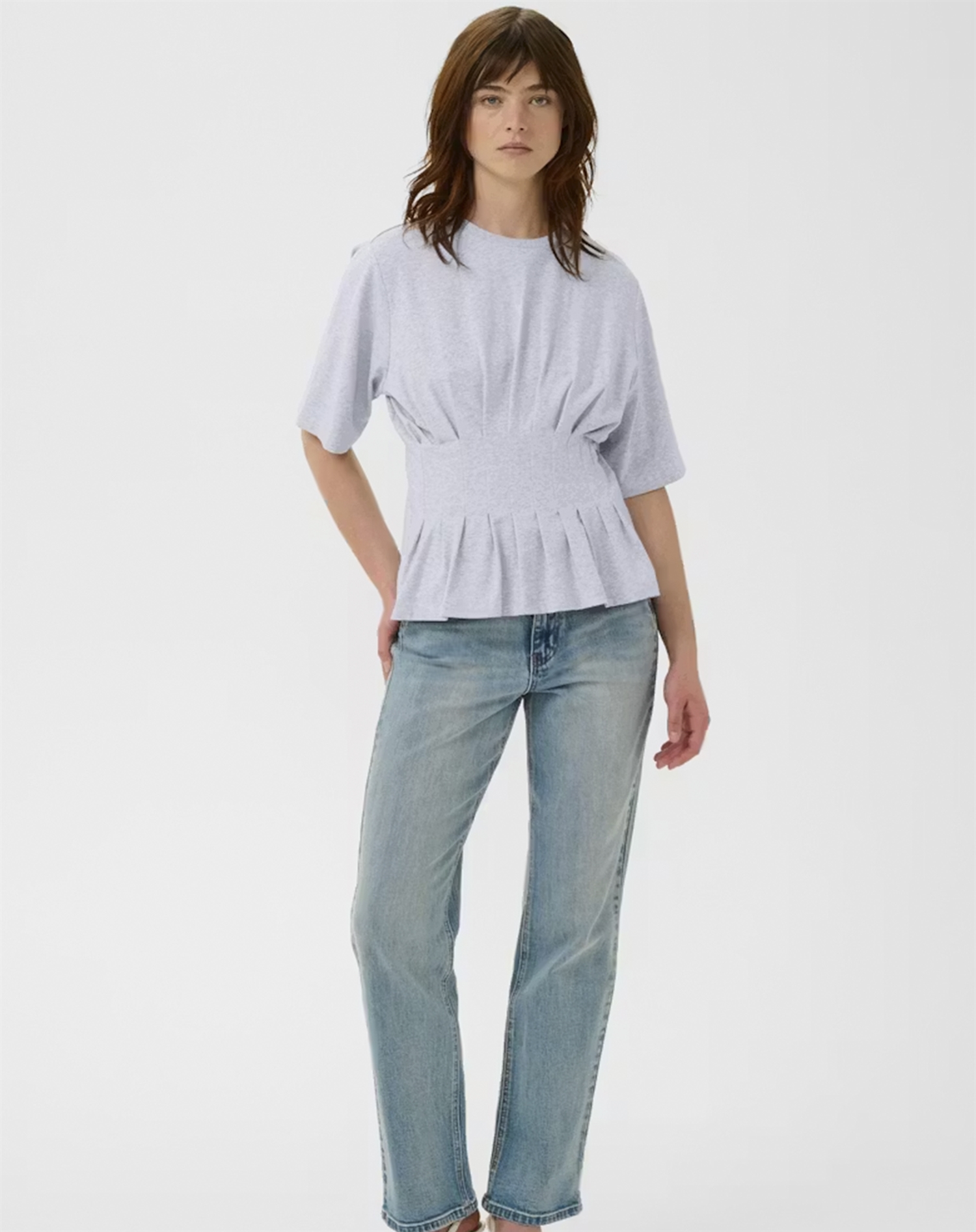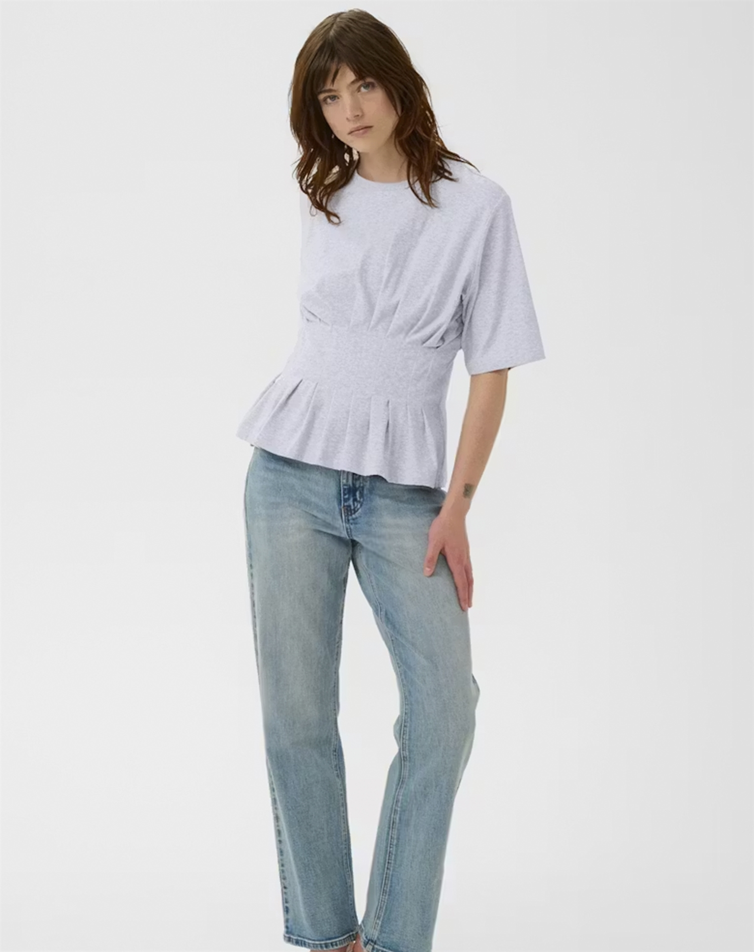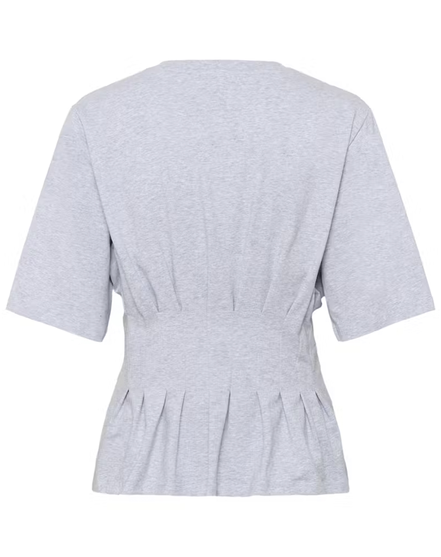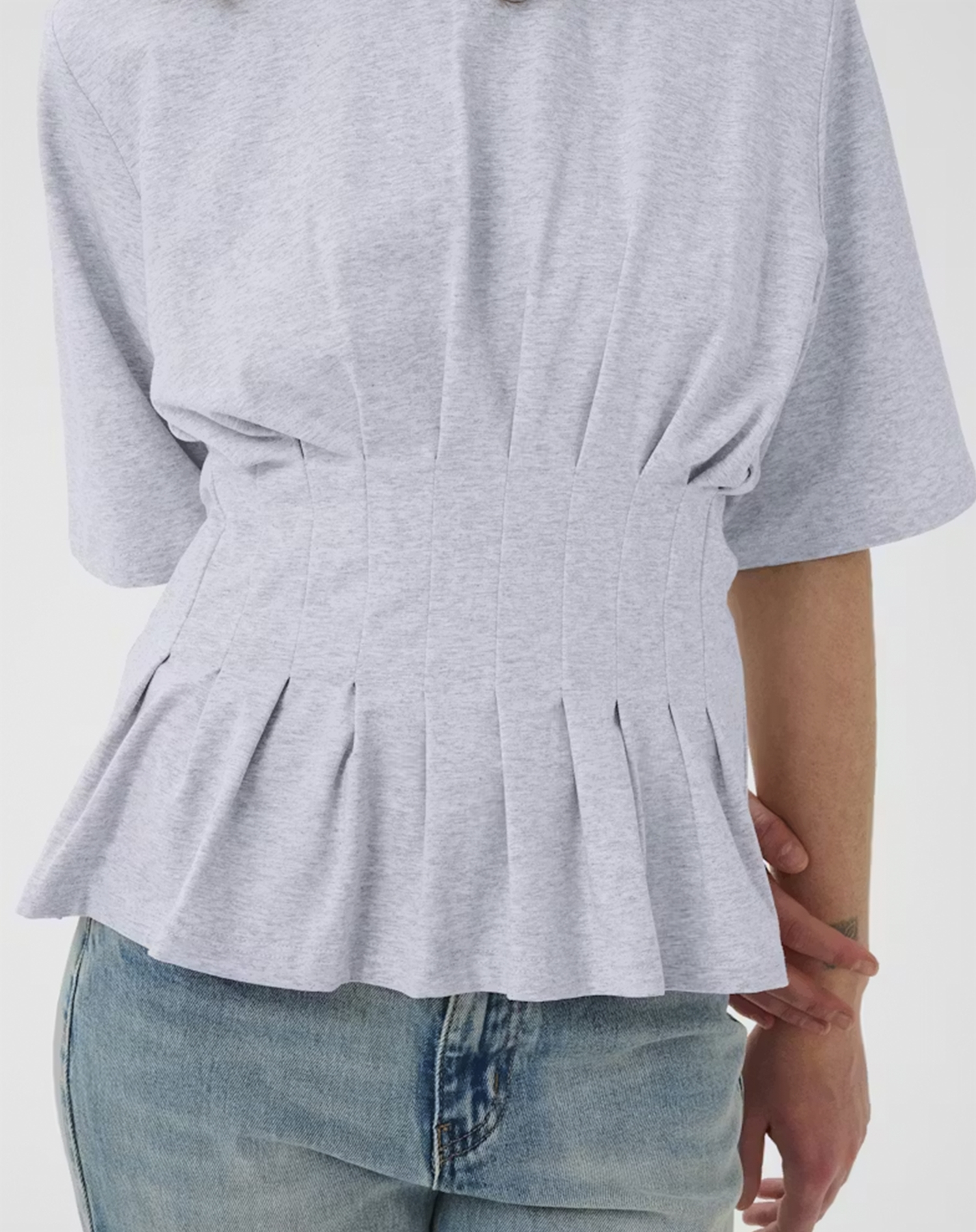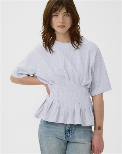 Det, der gør den ekstra lækker, er det diskrete melange-spil, som giver lidt struktur og liv i stoffet i stedet for et helt ensfarvet udtryk. Den lyse grå tone er samtidig nem at matche med både lyse sommernuancer og dybere vinterfarver. Resultatet er en tidløs T-shirt, du kan bruge sæson efter sæson.