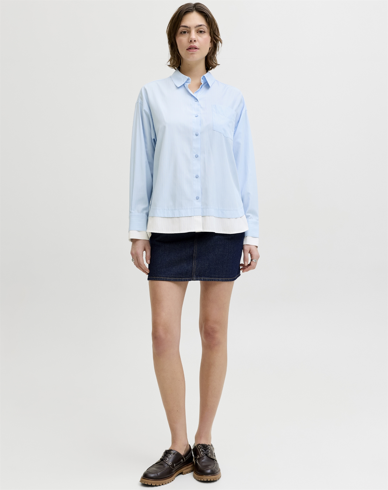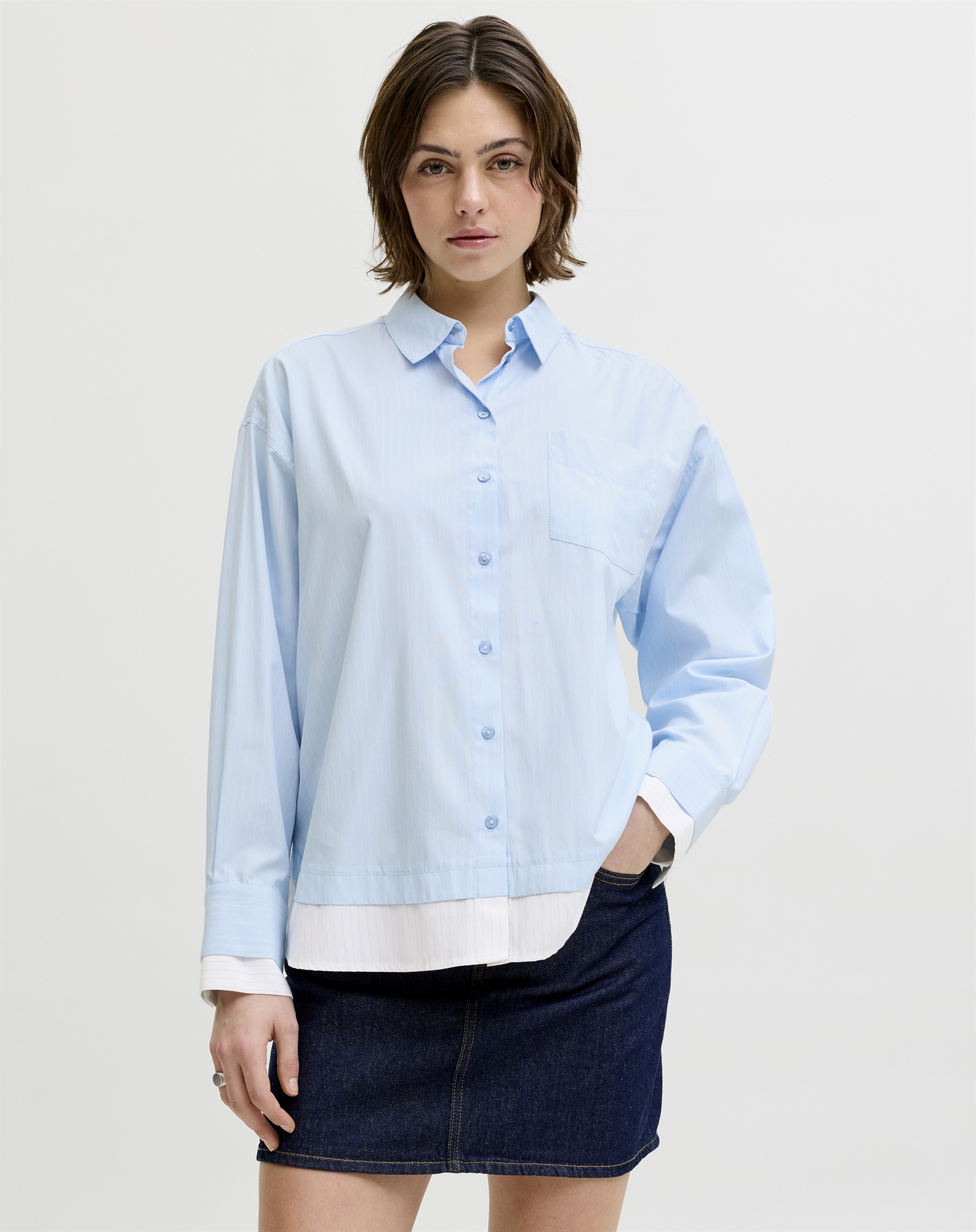 Det, der gør den til en favorit, er det klassiske snit og den store anvendelighed. Den kan hurtigt blive en fast del af garderoben, fordi den både ser godt ud og er rar at have på. Poplin-stoffet er let og typisk åndbart, så komforten følger med gennem dagen. Skyway-farven giver samtidig et friskt, roligt touch, der skiller sig ud på den underspillede måde.