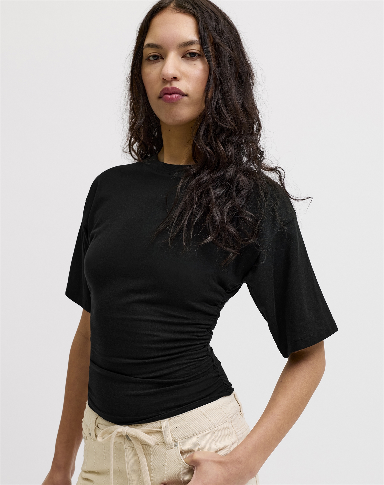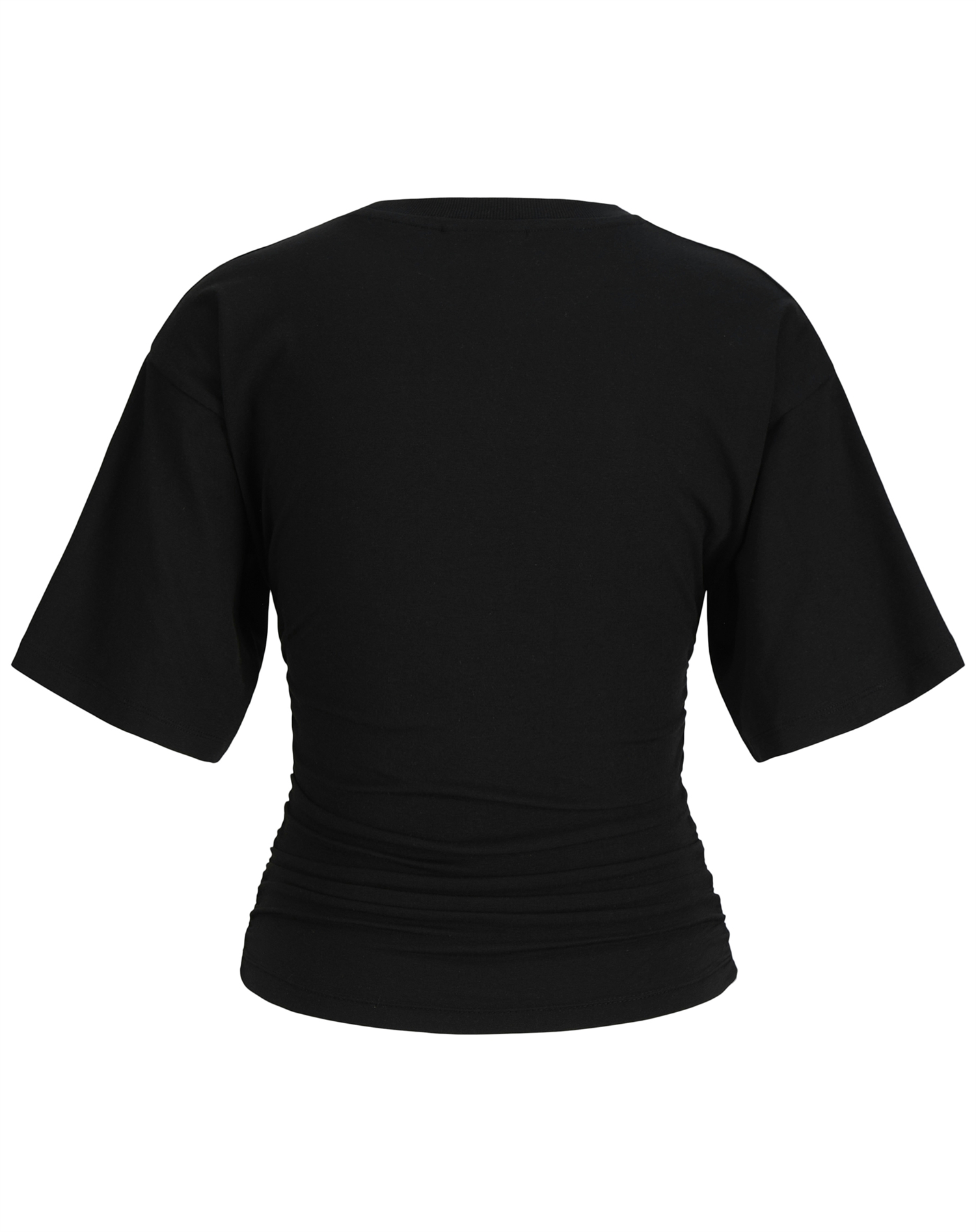 En sort t-shirt som denne er en sand styling-klassiker. Brug den med jeans for et afslappet look, style den under en blazer når det skal være mere skarpt, eller sæt den sammen med en nederdel for et mere feminint udtryk. Den passer ind i det meste og kan varieres igen og igen.