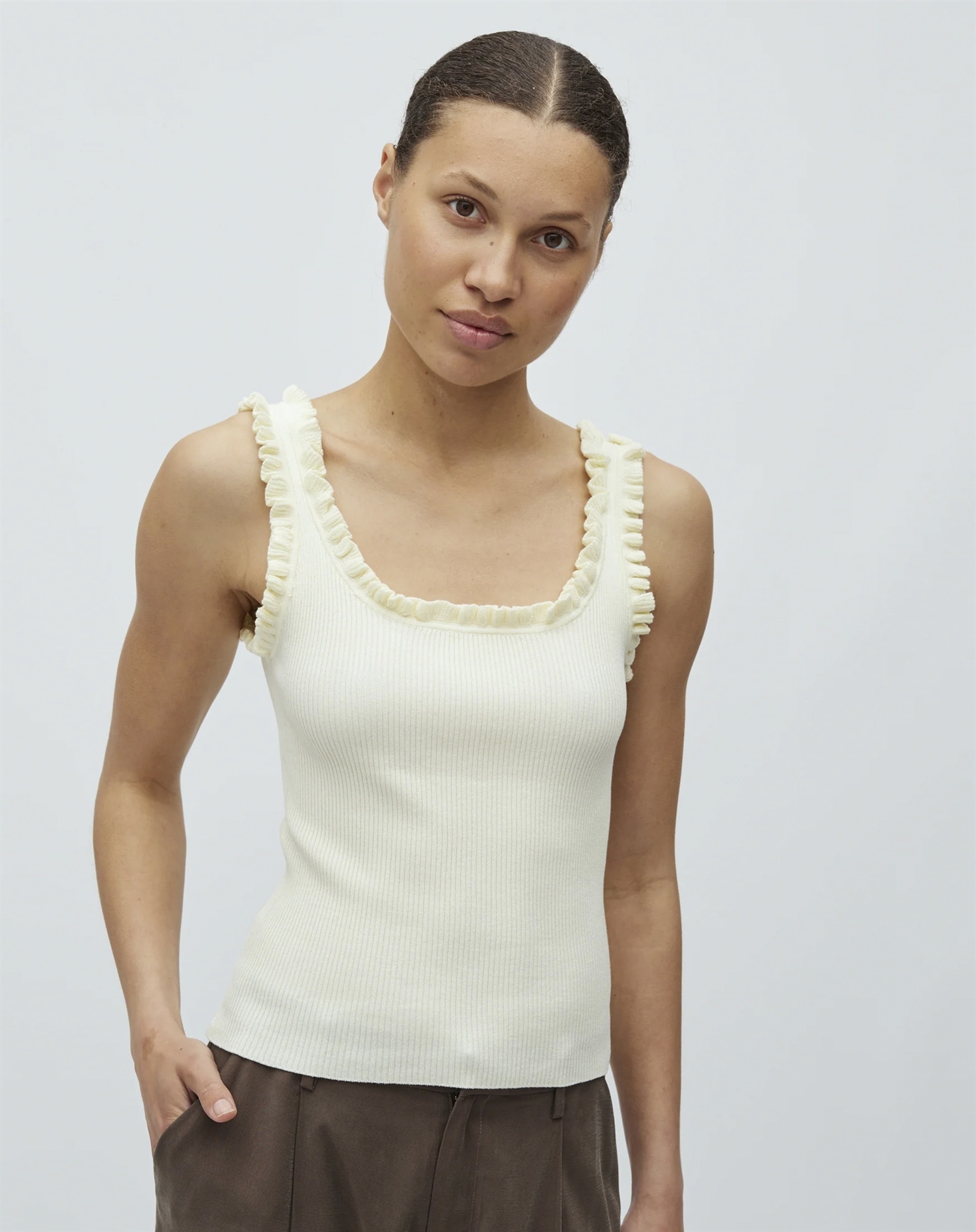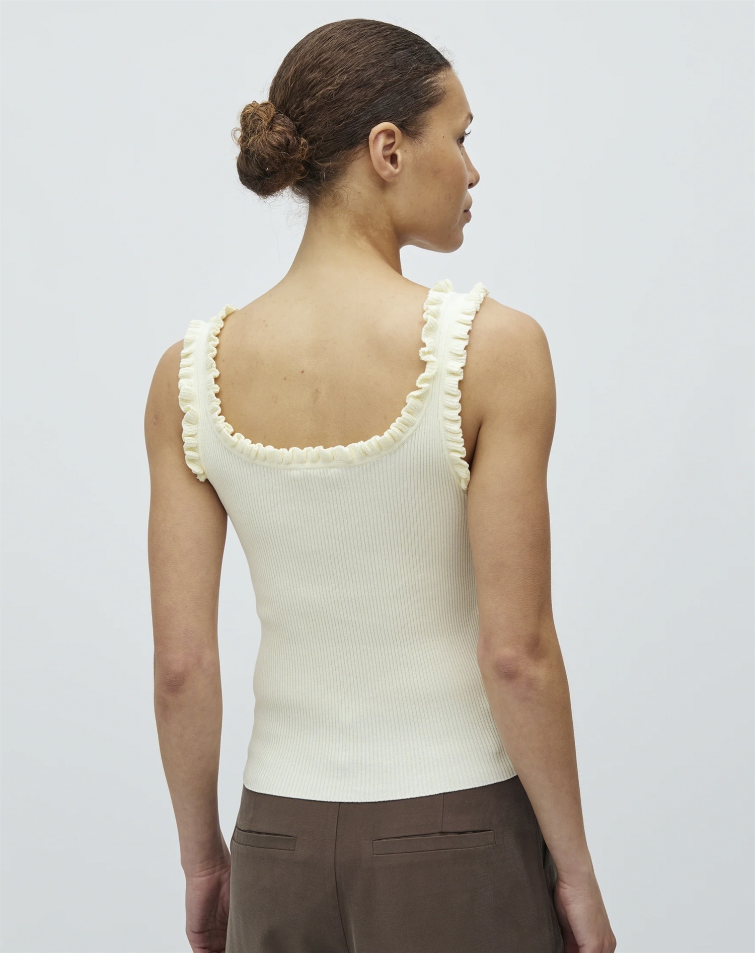 Sæt den sammen med højtaljede jeans for et afslappet outfit til fx brunch, eller vælg en pæn nederdel, når du skal ud om aftenen. På køligere dage fungerer den også perfekt under en let jakke, så du kan bruge den på tværs af sæsoner. Farven gør det desuden oplagt at lege med accessories, uanset om du går efter fine smykker eller en mere markant taske.