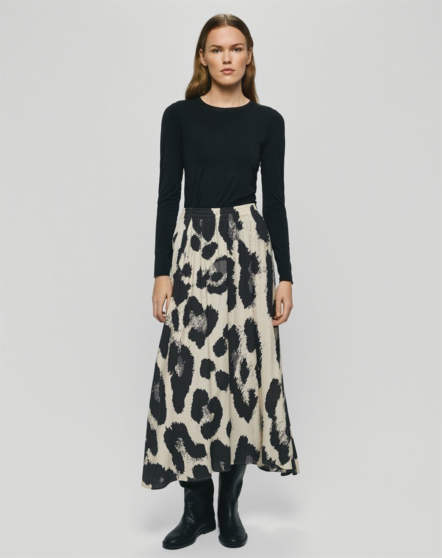 En leopardprintet nederdel som MSCH Copenhagen's MSCHKaralie Jusia HW Nederdel i Licorice Leo farven er både klassisk og dristig. Denne nederdel forener et evigt populært mønster med nutidig stil, hvilket gør den til et alsidigt valg i enhver garderobe. Det højtaljede design fremhæver ofte taljen og skaber en flatterende silhuet, der passer til mange kropsformer.