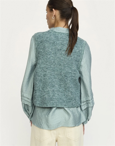 Forestil dig vesten over en skarp hvid skjorte, der skaber en kontrast, som både er klassisk og moderne. Eller bær den over en kjole for at tilføje et lag af tekstur og varme. Abyss Melange-farven gør det nemt at integrere vesten i både lyse og mørke garderober, og den subtile melange-effekt giver dit look ekstra dybde.