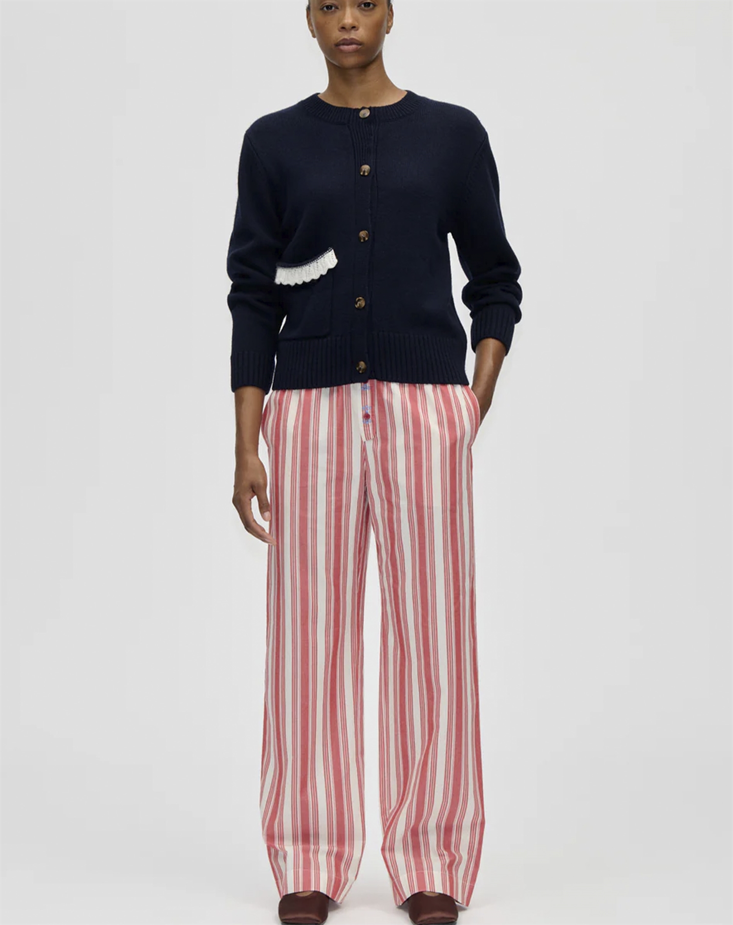 Hvorfor vil du elske disse bukser? Deres stribede design tilføjer visuel interesse, der løfter selv de enkleste outfits. Den gathered detalje skaber en flatterende silhuet, der passer til mange kropstyper. Scarlet Trot farven giver et friskt pust til din garderobe, og Stine Goya er kendt for kvalitet og sofistikeret design.
