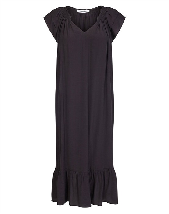 Lang kjole i stilfuldt design fra Co’Couture. Kjolen har en flot v-udskæring med smocksyninger samt korte ærmer med flot flæsekant. Kjolen har en let og løs pasform med flæsekant i bunden, som giver et flot og elegant fald samt et feminint look.