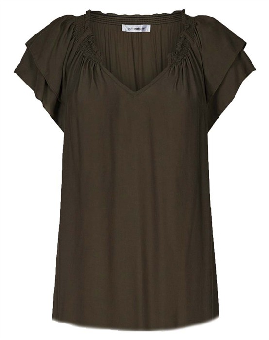 Skøn top fra Co’Couture i et tyndt og let materiale der gør, at den falder flot og elegant. Den har v-udskæring i halsen samt elastik i ryggen der giver et feminint look samt korte ærmer med flæse. Den har en komfortabel pasform der passer til enhver kropstype.