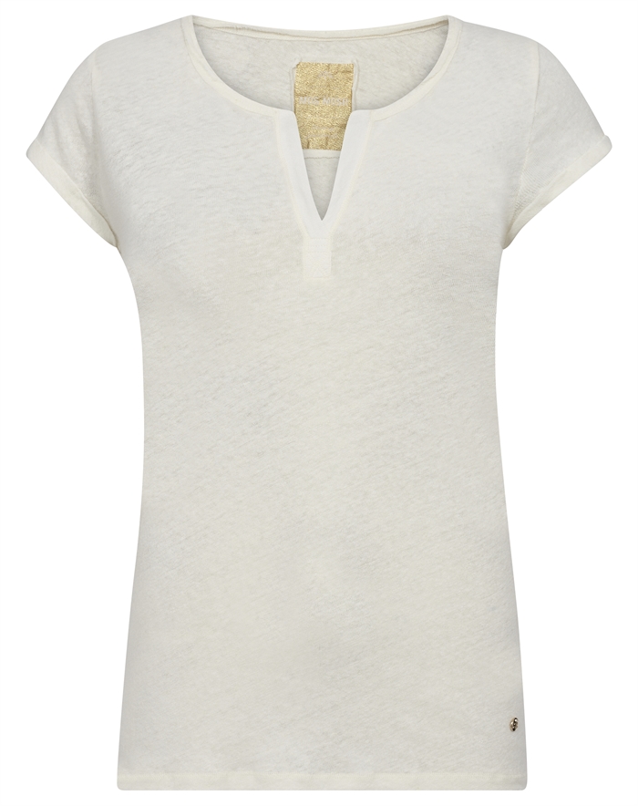 Troy T-shirt - Mos MoshEr du til t-shirts der har et rocket og jeans’et udtryk, er Troy t-shirten fra mos Mosh lige noget for dig. Den unikke t-shirts fra Mos Mosh dame har hele 50% hør i materialet kombineret med bomuld, hvilket giver t-shirtsen det helt rette look i nærmest “spindelsvævs-struktur” uden at være transparent. Det er samtidig netop den smukke struktur i t-shirtsen, der gør den både unik og anderledes fra en helt traditionel t-shirt i ren bomuld. Troy t-shirten har ligeledes en skøn v-udskæring med en klædelig detalje af lettere blank stolpe, der bryder og klæder den øvrige t-shirt i hørlook. T-shirten fra Mos Mosh dame falder flot og findes i perfekte basis farver. Vælg den army farvede for et råt look, den hvide for en stilren og neutral t-shirt i klædeskabet eller køb den sorte som en klassisk must-have til alle dages brug.