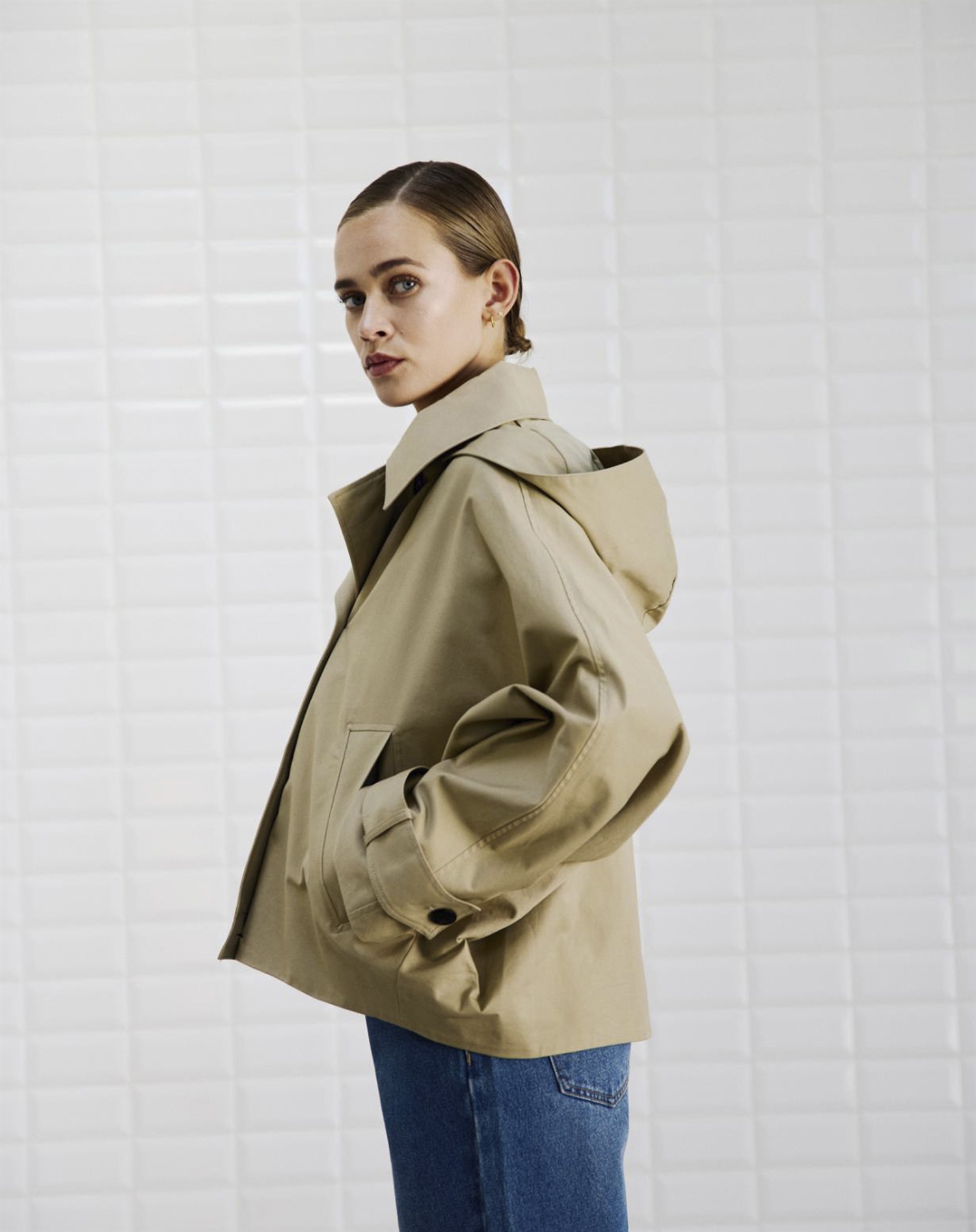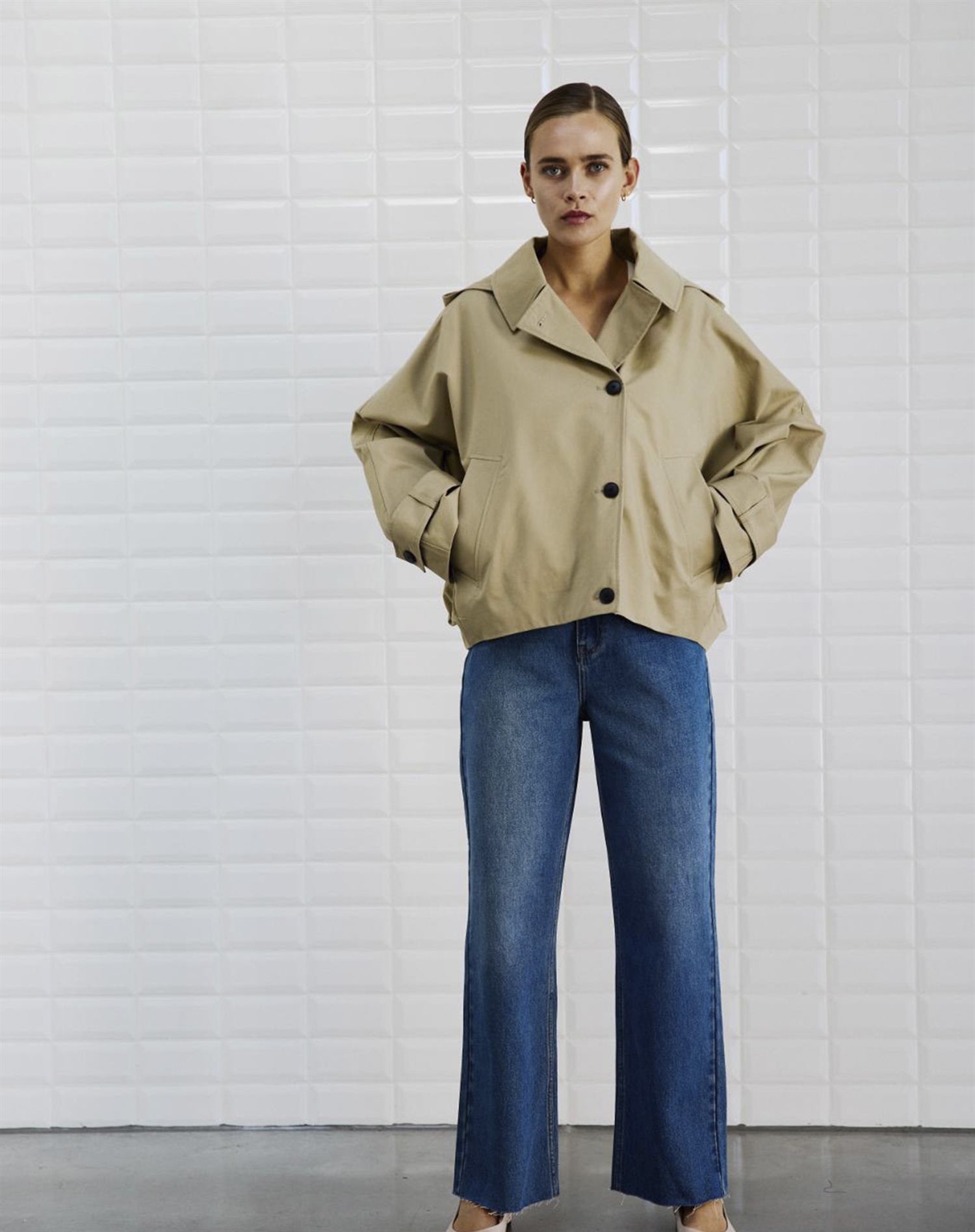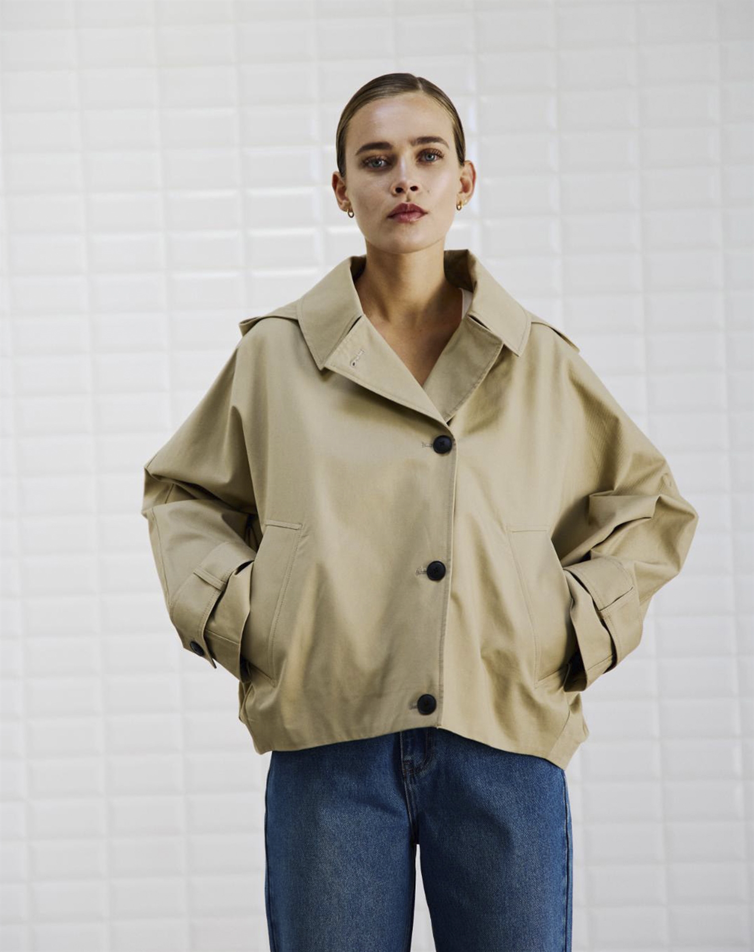 Denne jakke kan let kombineres med både jeans og støvler for et afslappet hverdagslook eller med chinos og en skarp skjorte, hvis du ønsker et mere sofistikeret udtryk. Tilføj et par solbriller og en rummelig taske, og du er klar til at tage verden med storm, uanset hvor dagen fører dig hen.