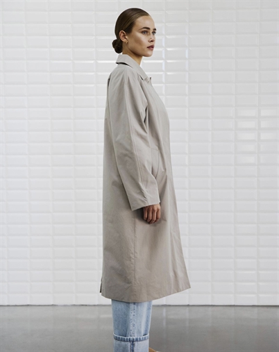 Hvorfor vil du elske den? Fordi den tilføjer elegance til din hverdag uden at gå på kompromis med komforten. Den midi-lange længde giver både stil og varme, mens den neutrale farve gør den let at integrere i din garderobe. Det er en frakke, du kan stole på sæson efter sæson, hvilket gør den til en klog investering.